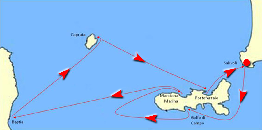 | 0950 Wir legen in Marina di Salivoli ab und segeln östlich an der Isola Palmaiola vorbei in Richtung auf die Südostspitze von Elba. 1225 Pte. del Ripati, Kurs W, entlang der Südküste Elbas. 1400 Im Golfo di Campo gehen wir vor Anker. Hier ist die Gelegenheit, das Dingi und den Außenborder zu testen, z.B. um in Marina di Campo Eis einzukaufen. |