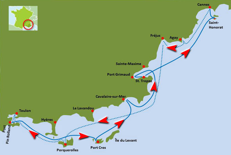 Im Golfe de la Napoule wird das Wetter etwas besser; einigen ist nach 'Baden' zumute. 1335 Anker fällt an der Nordseite der Île de Saint-Honorat. Nach den Schwimmrunden ums Boot geht die Crew mit dem Dingi an Land und erkundet Saint-Honorat. Der Skipper hält Ankerwache. 1600 Anker auf! Der Wind ist gerade richtig für ein paar Übungen unter Segel: Am-Wind-Kurse, Wenden, Abfallen, Vor-Wind-Kurse. 1715 Am Ponton d'Acceuille machen wir für die Nacht fest. Kein ruhiger Platz: Schwell durch Wind und Fähren und eine Baustelle am Kai sorgen für Abwechslung. |