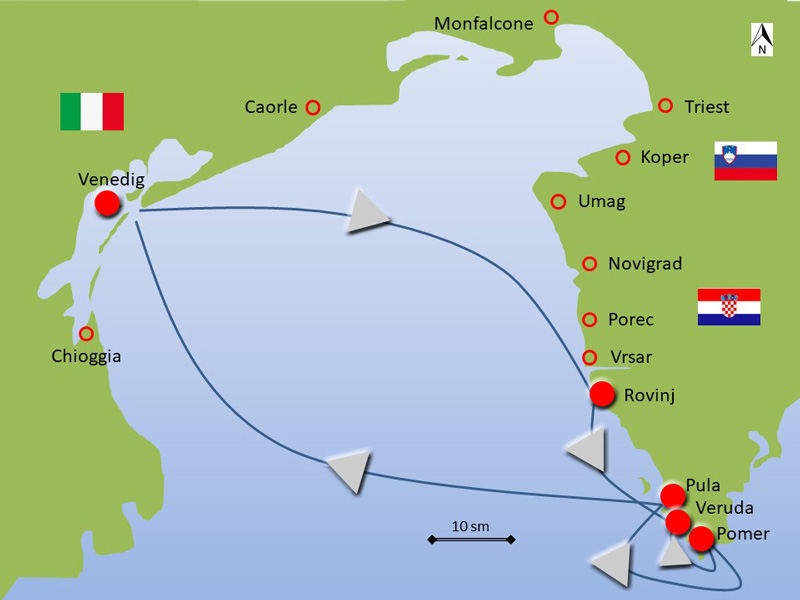 | nachmittags mit 2 Reffs, gegen Abend mit voller Genua vor dem Wind Es ist Vollmond und es wird nicht richtig dunkel. Wir können aufkommende Schiffe im Verkehrstrennungsgebiet in der Bucht von Venedig früh erkennen und uns gebührend frei halten. Die Ansteuerung des Porto Lido wird spannend: Der eingebaute Kartenplotter und die Deluis Clasing-Karte zeigen unterschiedliche Seezeichen. Die Realität ist dann nochmal anders! Die aktuelle Befeuerung der Baustelle für das Sturmflutsperrwerk passt weder zur einen, noch zur anderen Karte. Mit 4 Augen, einem guten Fernglas und etwas Erfahrung finden wir die Einfahrt in die Lagune. |