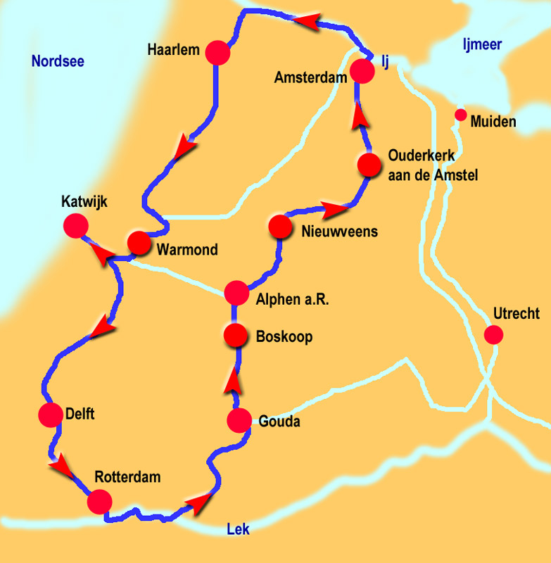 0945 ablegen 0950 Meldbrug, Haarlem 1000 Langebrug, Haarlem 1045 ╟ Ringvaart 1130 Hillegommerbrug, Hillegrom 1210 Lisserbrug, Lisse 1300 Buitenkaag, ╟ Ringvaart van de Haarlemmermeerpolder 1330 ╟ Kagerplassen: Ade, Diepenhoek, Kever, Spijkerboor, Zweiland, Warcker Leede 1420 Warmond 1500 fest bei Olympia |